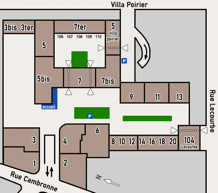 5 Villa Poirier : Situé juste à droite du 7 ter, le bâtiment est accessible par les 2 portes vitrées. Vous pouvez également accéder depuis la rue Villa Poirier (via Google Maps).